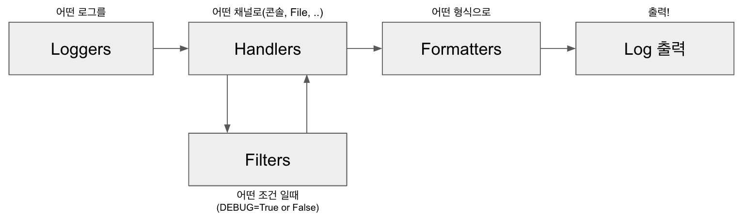 Django의 기본 Logger 는 django.util.log 에 정의되어 있다. 우리는 이를 settings.py에 재 정의해야 한다.